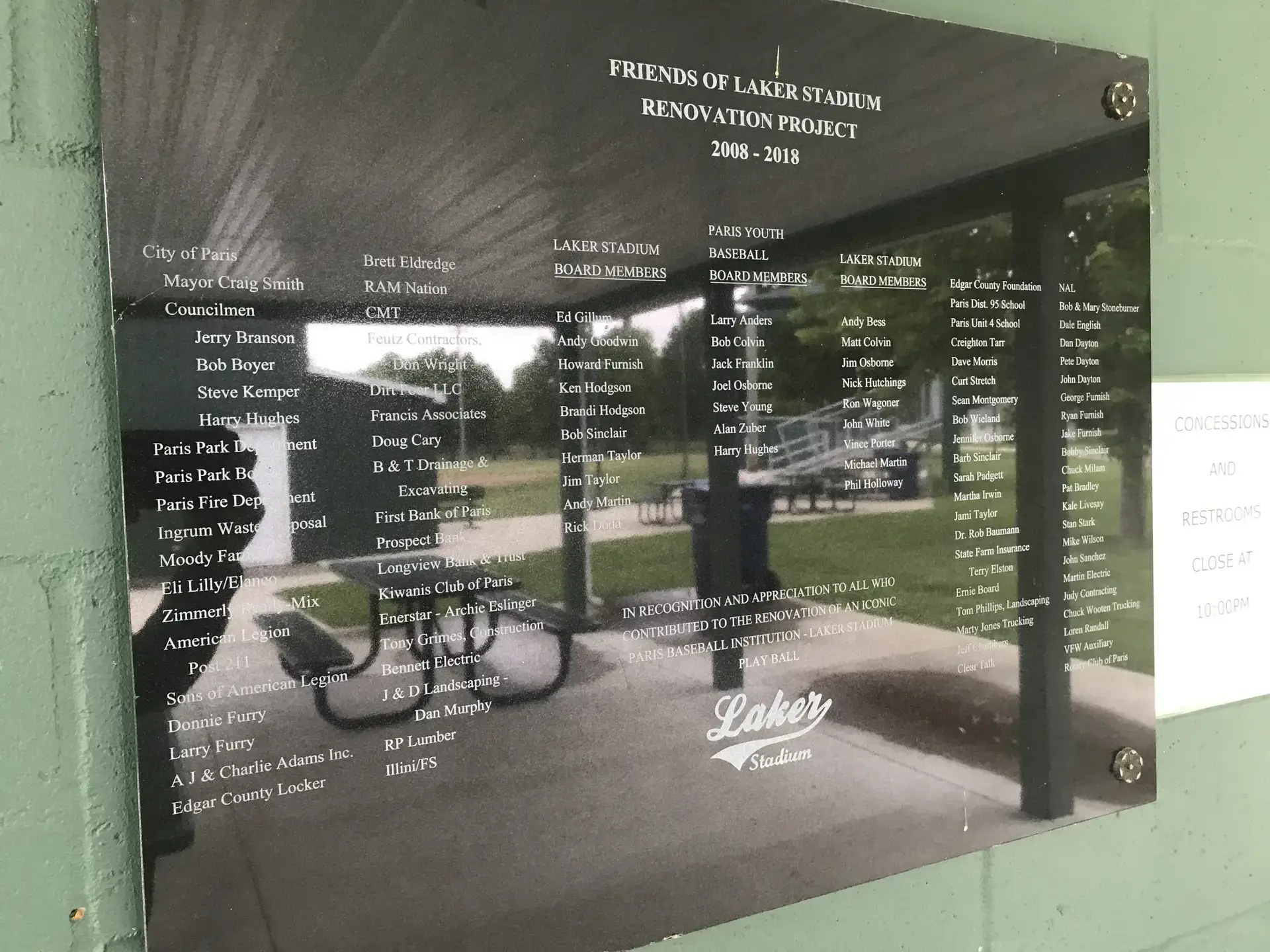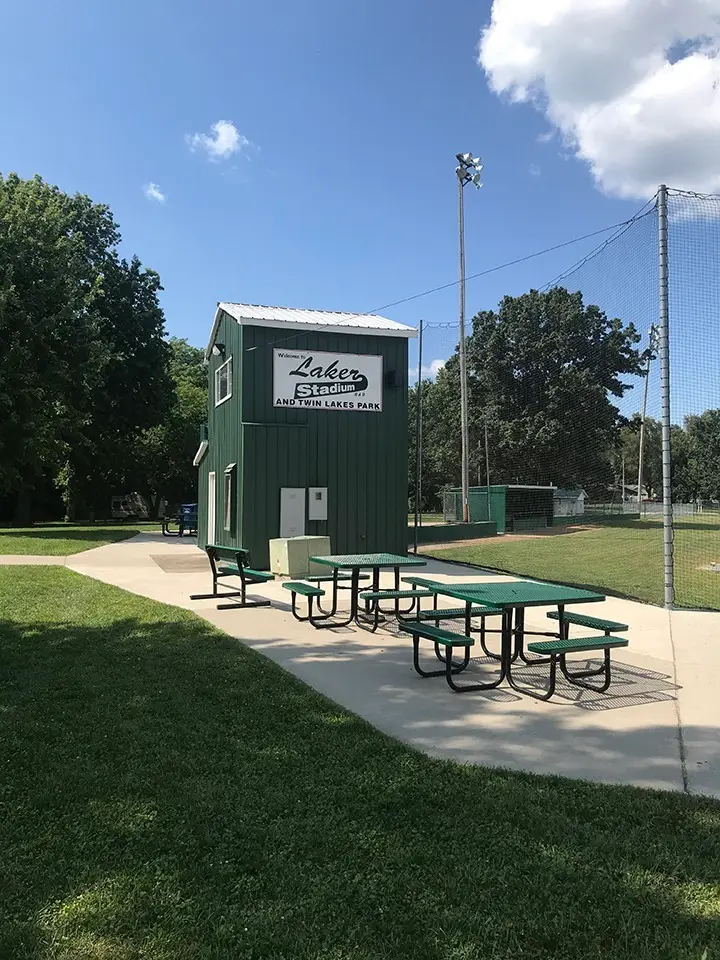The Lakers’ home field was Laker Stadium. Laker Stadium hosted the 1951 Mississippi–Ohio Valley League All-Star Game. The ballfield and part of the original stands are still in use today at the stadium, which sits within Twin Lakes Park. The address is 137 West Steidl Road, Paris. The most recent addition to Twin Lakes Park is the trailer park adjacent to the baseball diamond. It contains trailer spaces with electrical hookups, self-standing barbecues, picnic tables, refuse removal, and a bathhouse containing water, shower, and restroom facilities.